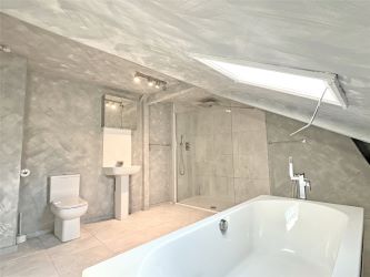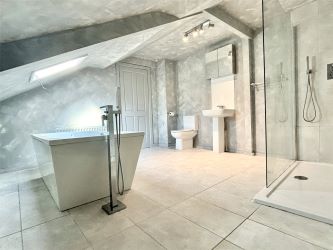 On the top floor, you’ll find two well-proportioned bedrooms. The master bedroom is generously sized with views over the private courtyard and excellent built-in storage. The second bedroom features a Velux window, adding to the bright and airy feel. The bathroom is impressive in size and includes a separate bath, stylish shower, WC, and additional storage.